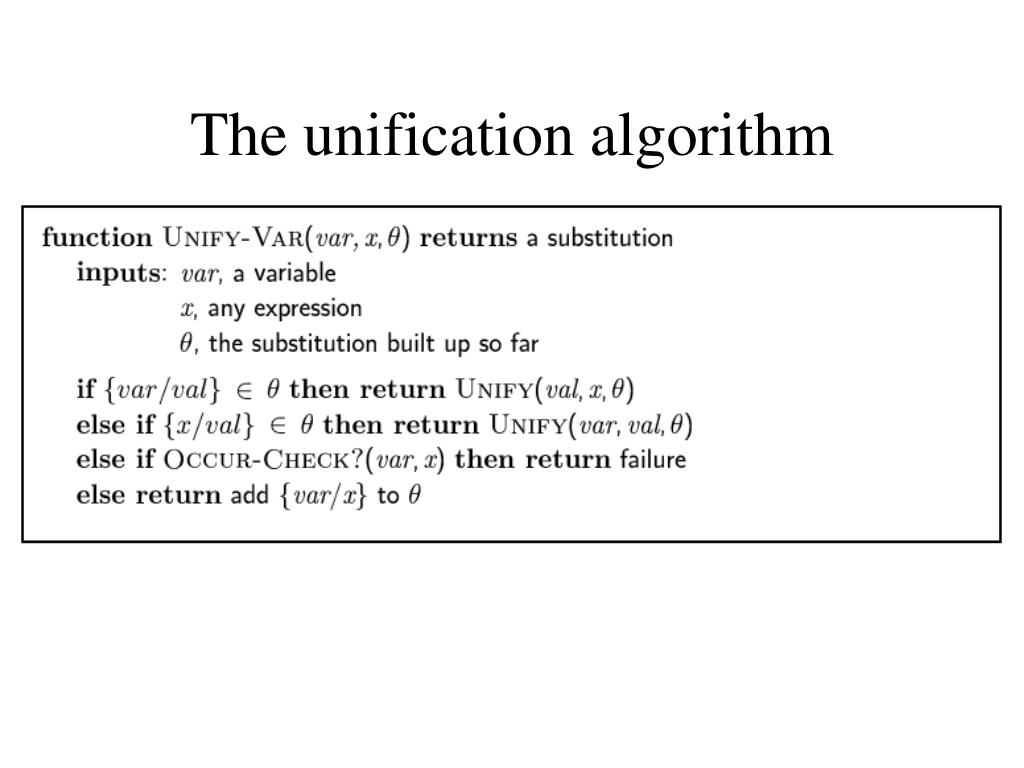 Unification p q Knows(John,x) Knows(John,Jane) {x/Jane} Knows(John,x) Knows(y,OJ) {x/OJ,y/John} Knows(John,x) Knows(y,Mother(y)) Knows(John,x) Knows(x,OJ)