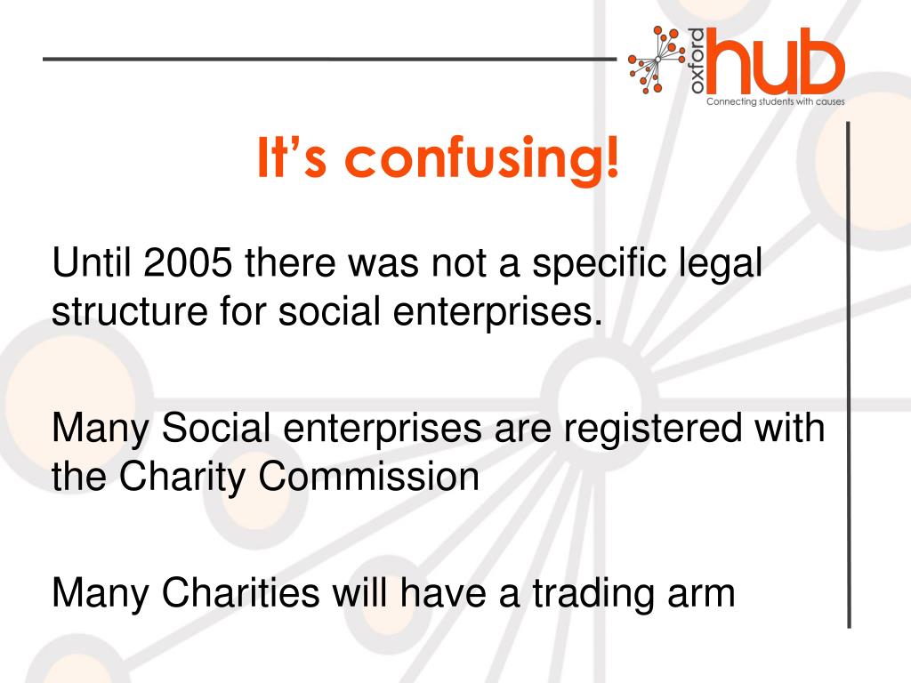 It’s confusing! Until 2005 there was not a specific legal structure for social enterprises. Many Social enterprises are registered with the Charity Commission Many Charities will have a trading arm