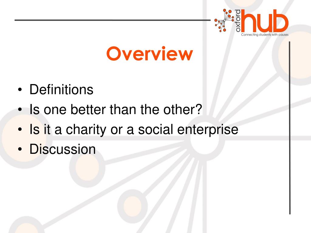 Overview • Definitions • Is one better than the other? • Is it a charity or a social enterprise • Discussion