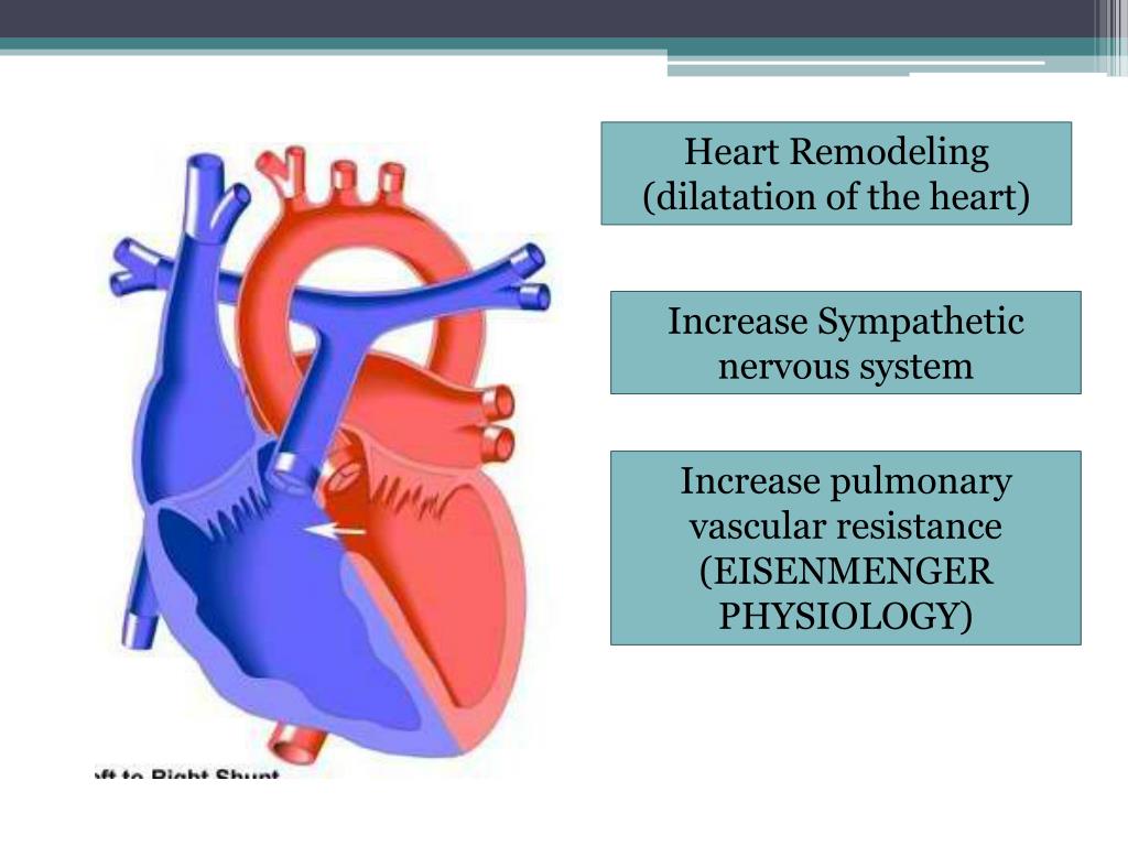 Heart Remodeling (dilatation of the heart) Increase Sympathetic nervous system Increase pulmonary vascular resistance (EISENMENGER PHYSIOLOGY)