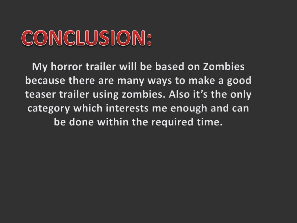 CONCLUSION: My horror trailer will be based on Zombies because there are many ways to make a good teaser trailer using zombies. Also it’s the only category which interests me enough and can be done within the required time.