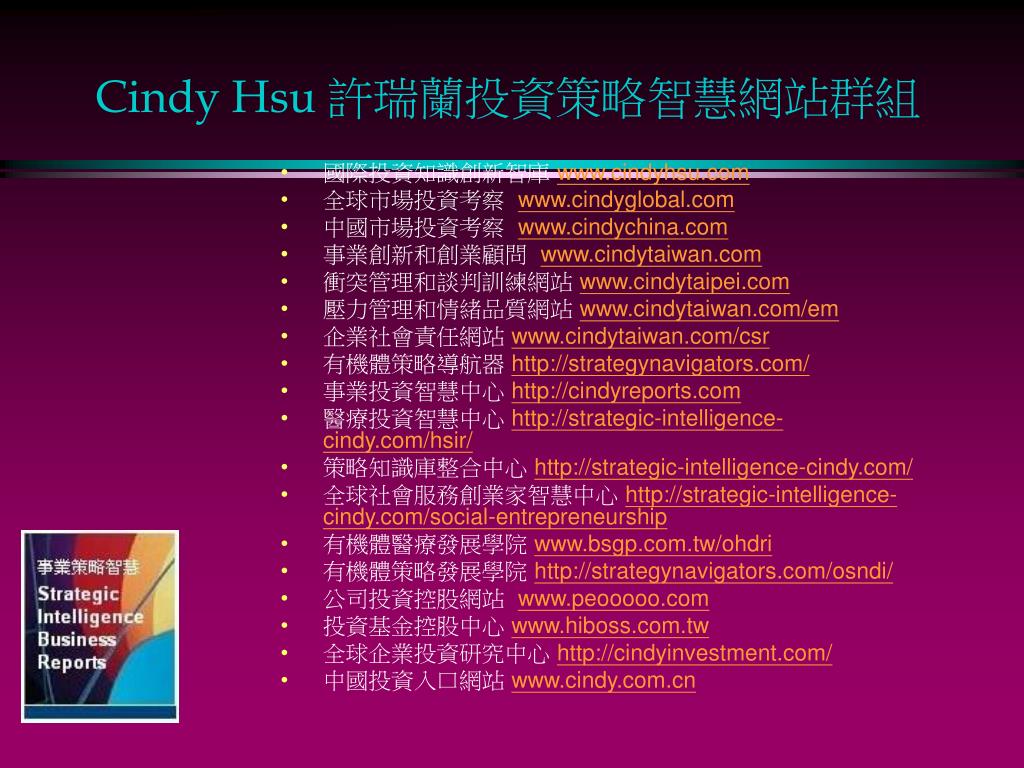Cindy Hsu 許瑞蘭投資策略智慧網站群組 • 國際投資知識創新智庫 www.cindyhsu.com • 全球市場投資考察 www.cindyglobal.com • 中國市場投資考察 www.cindychina.com • 事業創新和創業顧問 www.cindytaiwan.com • 衝突管理和談判訓練網站 www.cindytaipei.com • 壓力管理和情緒品質網站 www.cindytaiwan.com/em • 企業社會責任網站 www.cindytaiwan.com/csr • 有機體策略導航器 http://strategynavigators.com/ • 事業投資智慧中心 http://cindyreports.com • 醫療投資智慧中心 http://strategic-intelligence-cindy.com/hsir/ • 策略知識庫整合中心 http://strategic-intelligence-cindy.com/ • 全球社會服務創業家智慧中心 http://strategic-intelligence-cindy.com/social-entrepreneurship • 有機體醫療發展學院 www.bsgp.com.tw/ohdri • 有機體策略發展學院 http://strategynavigators.com/osndi/ • 公司投資控股網站 www.peooooo.com • 投資基金控股中心 www.hiboss.com.tw • 全球企業投資研究中心 http://cindyinvestment.com/ • 中國投資入口網站 www.cindy.com.cn
