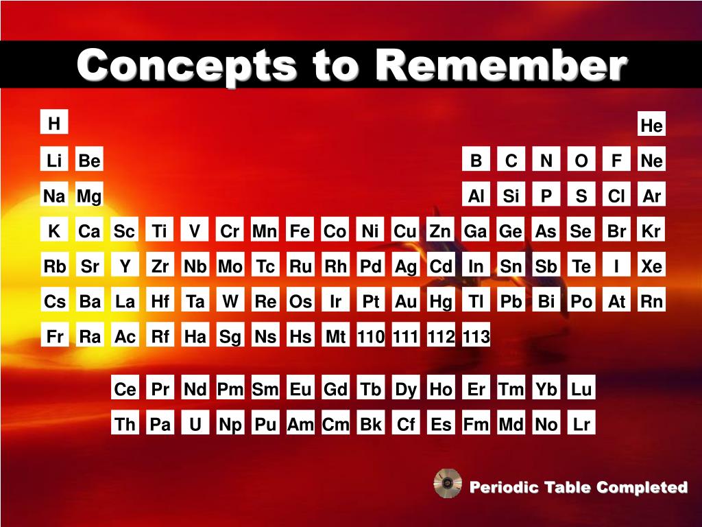 Concepts to Remember H He Li Be B C N O F Ne Na Mg Al Si P S Cl Ar K Ca Sc Ti V Cr Mn Fe Co Ni Cu Zn Ga Ge As Se Br Kr Rb Sr Y Zr Nb Mo Tc Ru Rh Pd Ag Cd In Sn Sb Te I Xe Cs Ba La Hf Ta W Re Os Ir Pt Au Hg Tl Pb Bi Po At Rn Fr Ra Ac Rf Ha Sg Ns Hs Mt 110 111 112 113 Ce Pr Nd Pm Sm Eu Gd Tb Dy Ho Er Tm Yb Lu Th Pa U Np Pu Am Cm Bk Cf Es Fm Md No Lr Periodic Table Completed