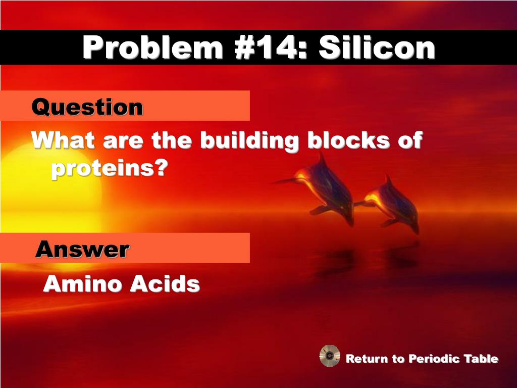 Problem #14: Silicon Question What are the building blocks of proteins? Answer Amino Acids Return to Periodic Table