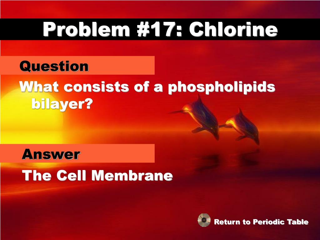 Problem #17: Chlorine Question What consists of a phospholipids bilayer? Answer The Cell Membrane Return to Periodic Table