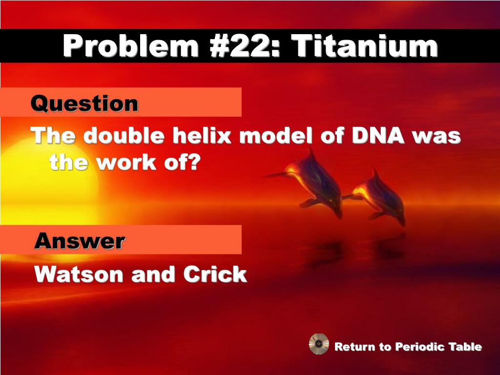 Problem #22: Titanium Question The double helix model of DNA was the work of? Answer Watson and Crick Return to Periodic Table