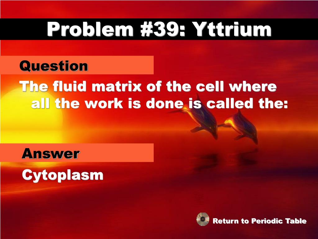 Problem #39: Yttrium Question The fluid matrix of the cell where all the work is done is called the: Answer Cytoplasm Return to Periodic Table