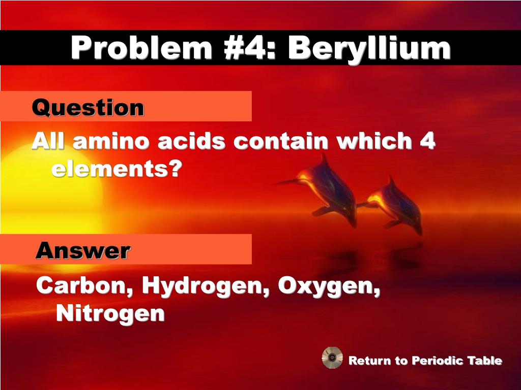 Problem #4: Beryllium Question All amino acids contain which 4 elements? Answer Carbon, Hydrogen, Oxygen, Nitrogen Return to Periodic Table