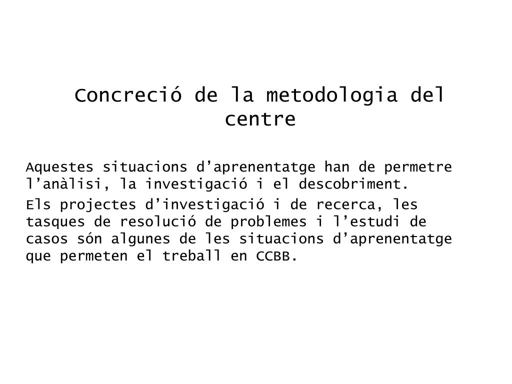 Concreció de la metodologia del centre Aquestes situacions d’aprenentatge han de permetre l’anàlisi, la investigació i el descobriment. Els projectes d’investigació i de recerca, les tasques de resolució de problemes i l’estudi de casos són algunes de les situacions d’aprenentatge que permeten el treball en CCBB.
