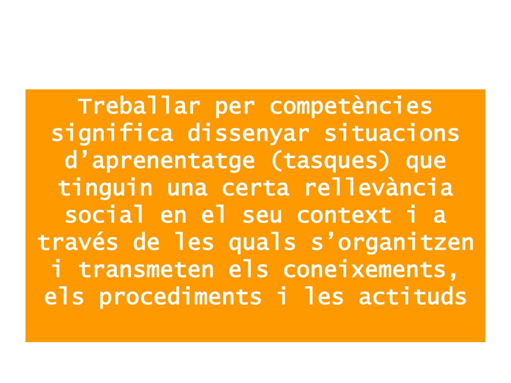 Treballar per competències significa dissenyar situacions d’aprenentatge (tasques) que tinguin una certa rellevància social en el seu context i a través de les quals s’organitzen i transmeten els coneixements, els procediments i les actituds