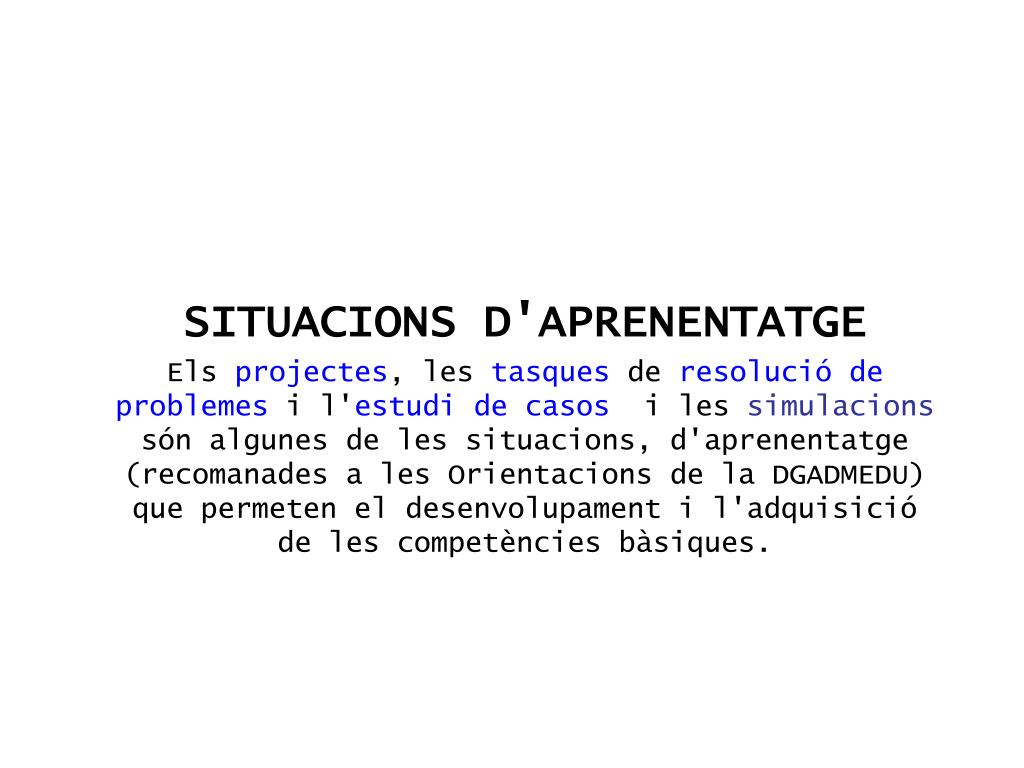 SITUACIONS D'APRENENTATGE Els projectes, les tasques de resolució de problemes i l'estudi de casos i les simulacions són algunes de les situacions, d'aprenentatge (recomanades a les Orientacions de la DGADMEDU) que permeten el desenvolupament i l'adquisició de les competències bàsiques.