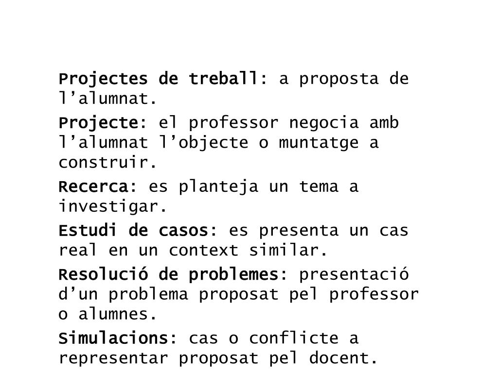 Projectes de treball: a proposta de l’alumnat. Projecte: el professor negocia amb l’alumnat l’objecte o muntatge a construir. Recerca: es planteja un tema a investigar. Estudi de casos: es presenta un cas real en un context similar. Resolució de problemes: presentació d’un problema proposat pel professor o alumnes. Simulacions: cas o conflicte a representar proposat pel docent.