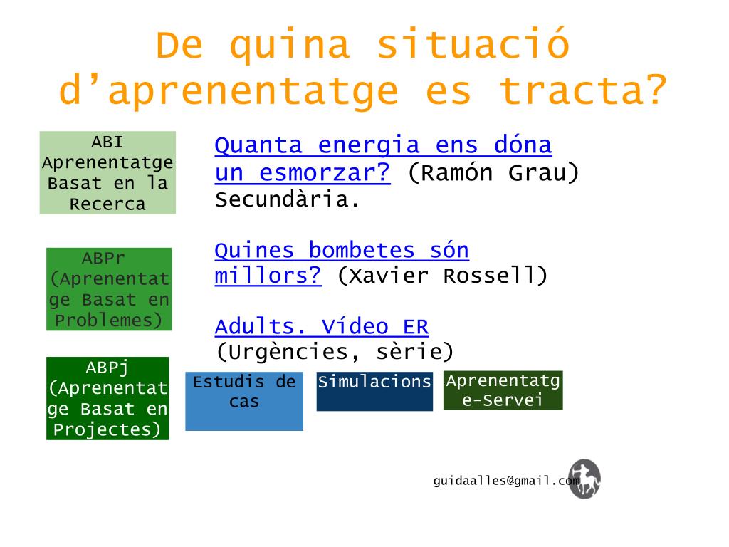 De quina situació d’aprenentatge es tracta? ABI Aprenentatge Basat en la Recerca Quanta energia ens dóna un esmorzar? (Ramón Grau) Secundària. Quines bombetes són millors? (Xavier Rossell) Adults. Vídeo ER (Urgències, sèrie) ABPr (Aprenentatge Basat en Problemes) ABPj (Aprenentatge Basat en Projectes) Aprenentatge-Servei Estudis de cas Simulacions guidaalles@gmail.com