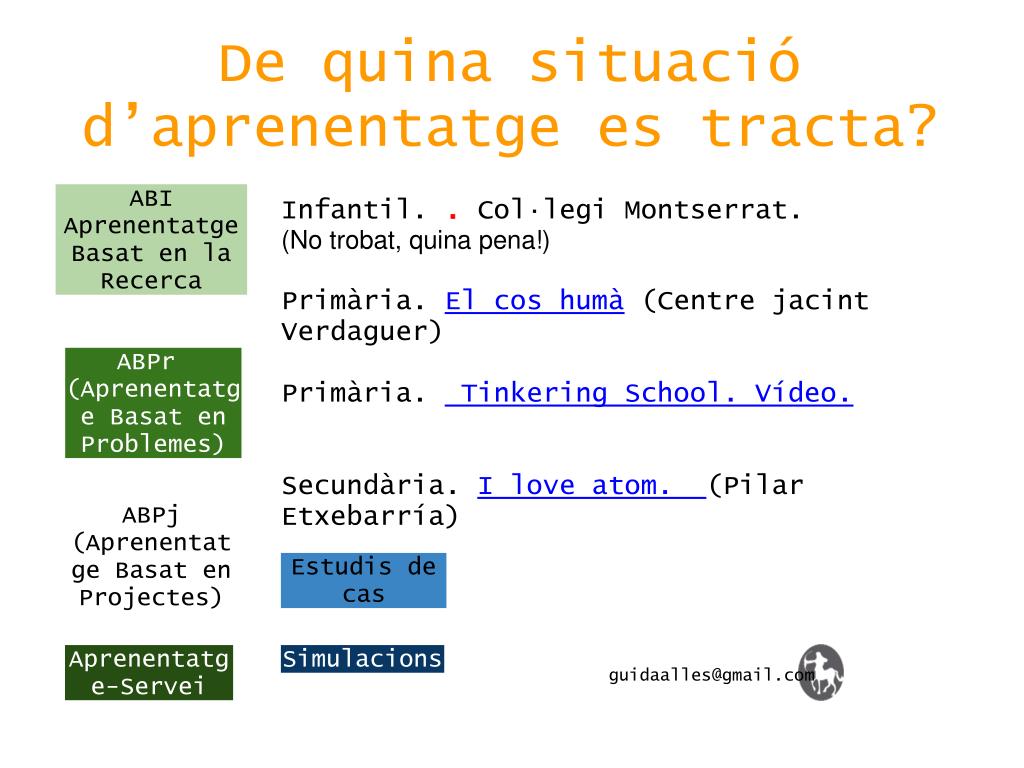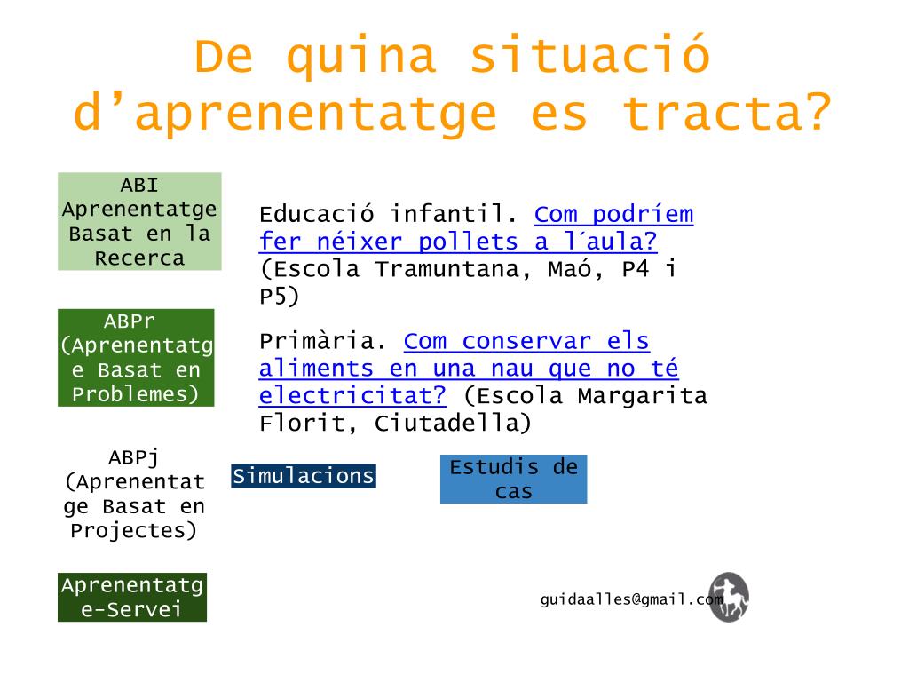 De quina situació d’aprenentatge es tracta? ABI Aprenentatge Basat en la Recerca Educació infantil. Com podríem fer néixer pollets a l´aula? (Escola Tramuntana, Maó, P4 i P5) ABPr (Aprenentatge Basat en Problemes) Primària. Com conservar els aliments en una nau que no té electricitat? (Escola Margarita Florit, Ciutadella) ABPj (Aprenentatge Basat en Projectes) Estudis de cas Simulacions Aprenentatge-Servei guidaalles@gmail.com