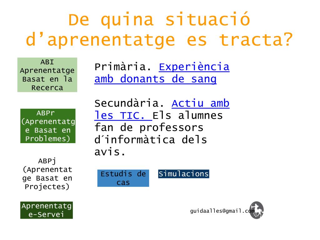 De quina situació d’aprenentatge es tracta? ABI Aprenentatge Basat en la Recerca Primària. Experiència amb donants de sang Secundària. Actiu amb les TIC. Els alumnes fan de professors d´informàtica dels avis. ABPr (Aprenentatge Basat en Problemes) ABPj (Aprenentatge Basat en Projectes) Estudis de cas Simulacions Aprenentatge-Servei guidaalles@gmail.com