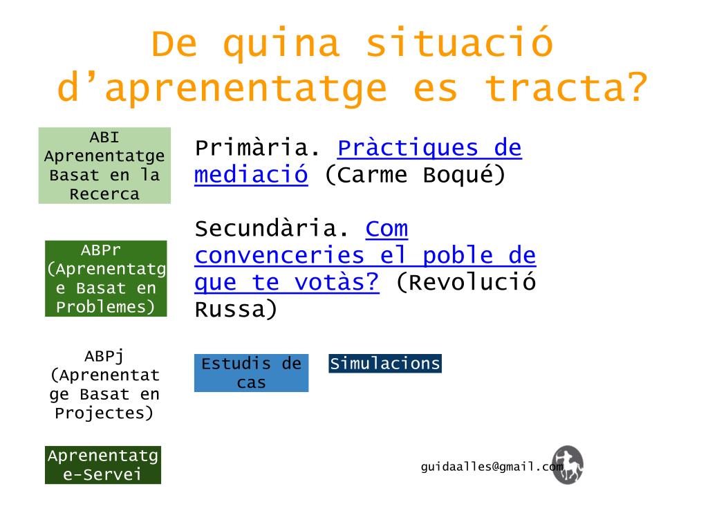 De quina situació d’aprenentatge es tracta? ABI Aprenentatge Basat en la Recerca Primària. Pràctiques de mediació (Carme Boqué) Secundària. Com convenceries el poble de que te votàs? (Revolució Russa) ABPr (Aprenentatge Basat en Problemes) ABPj (Aprenentatge Basat en Projectes) Estudis de cas Simulacions Aprenentatge-Servei guidaalles@gmail.com