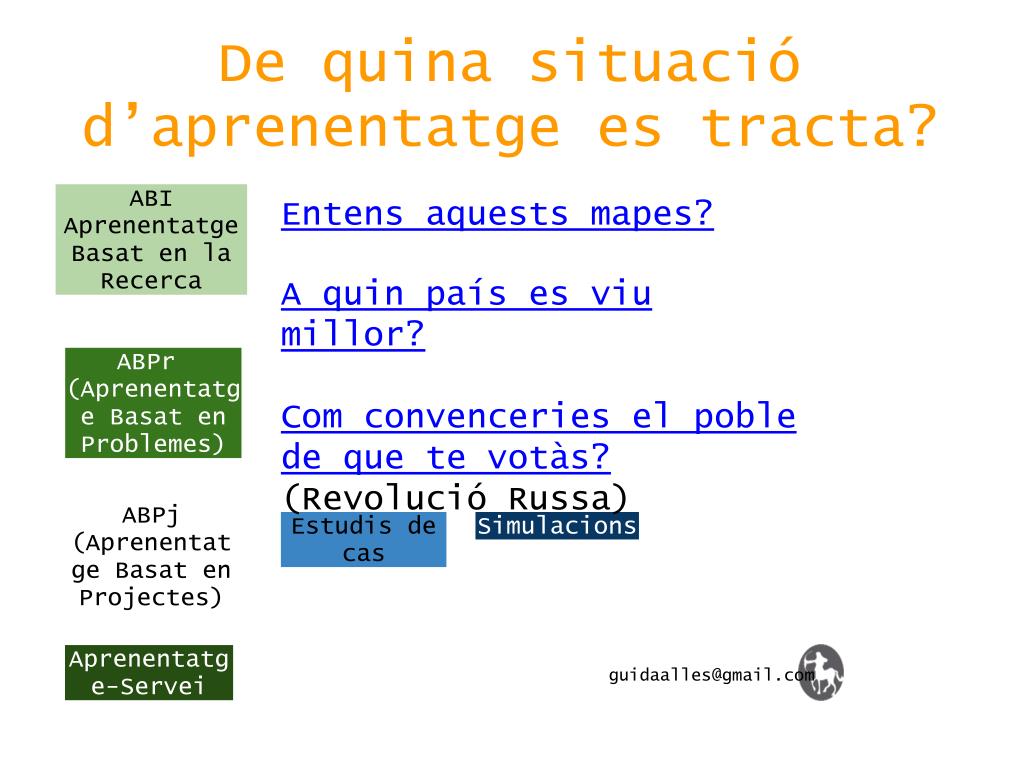 De quina situació d’aprenentatge es tracta? ABI Aprenentatge Basat en la Recerca Entens aquests mapes? A quin país es viu millor? Com convenceries el poble de que te votàs? (Revolució Russa) ABPr (Aprenentatge Basat en Problemes) ABPj (Aprenentatge Basat en Projectes) Estudis de cas Simulacions Aprenentatge-Servei guidaalles@gmail.com