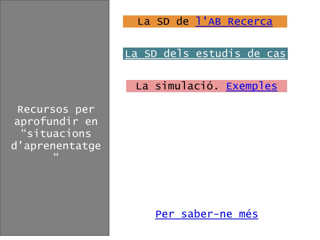 La SD de l'AB Recerca Com avaluar? La SD dels estudis de cas La simulació. Exemples Recursos per aprofundir en “situacions d’aprenentatge” Per saber-ne més
