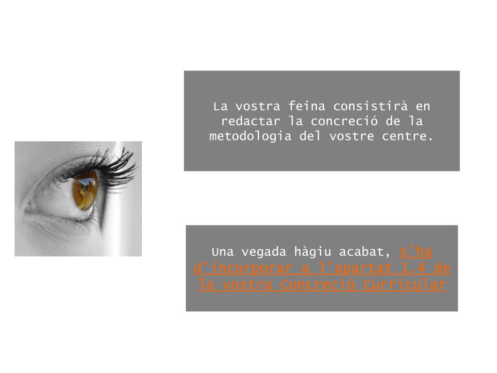 La vostra feina consistirà en redactar la concreció de la metodologia del vostre centre. Una vegada hàgiu acabat,s’ha d’incorporar a l'apartat 1.4 de la vostra Concreció Curricular