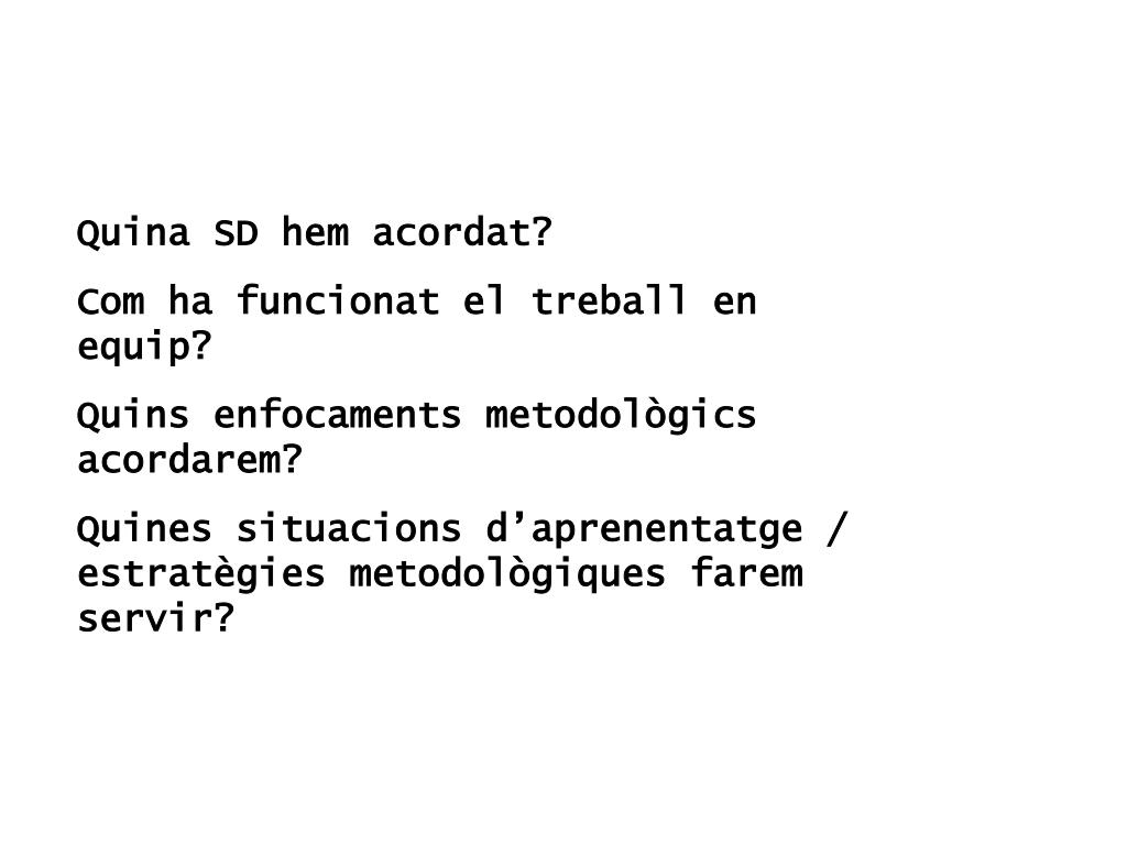 Quina SD hem acordat? Com ha funcionat el treball en equip? Quins enfocaments metodològics acordarem? Quines situacions d’aprenentatge / estratègies metodològiques farem servir?