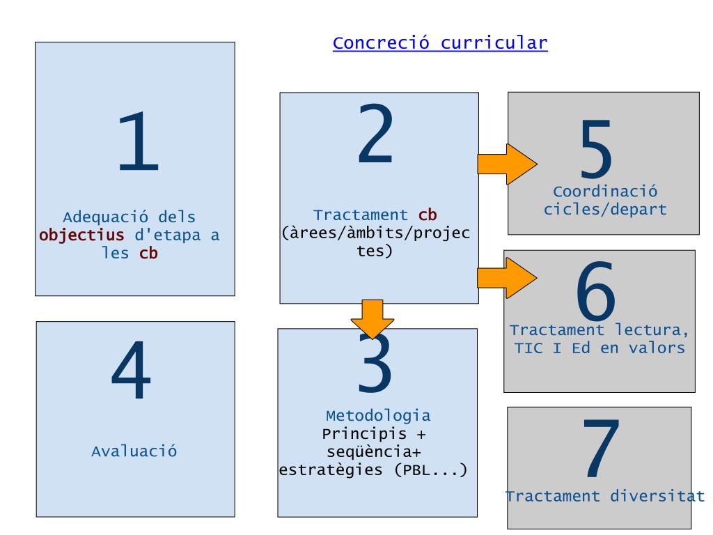 Concreció curricular 2 1 5 Coordinació cicles/depart Tractament cb (àrees/àmbits/projectes) Adequació dels objectius d'etapa a les cb 6 Tractament lectura, TIC I Ed en valors 3 4 Metodologia Principis + seqüència+ estratègies (PBL...) 7 Avaluació Tractament diversitat