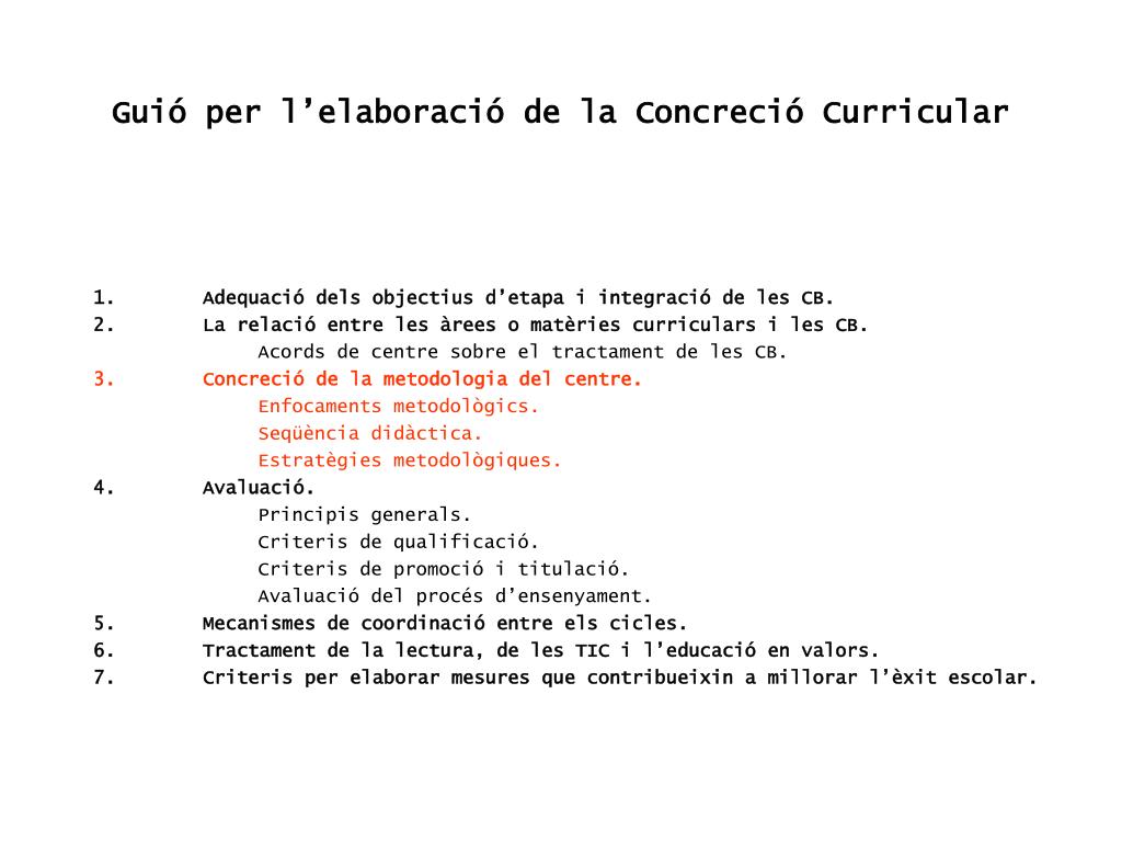 Guió per l’elaboració de la Concreció Curricular 1. Adequació dels objectius d’etapa i integració de les CB. 2. La relació entre les àrees o matèries curriculars i les CB. Acords de centre sobre el tractament de les CB. 3. Concreció de la metodologia del centre. Enfocaments metodològics. Seqüència didàctica. Estratègies metodològiques. 4. Avaluació. Principis generals. Criteris de qualificació. Criteris de promoció i titulació. Avaluació del procés d’ensenyament. 5. Mecanismes de coordinació entre els cicles. 6. Tractament de la lectura, de les TIC i l’educació en valors. 7. Criteris per elaborar mesures que contribueixin a millorar l’èxit escolar.