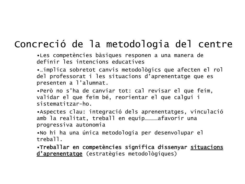Concreció de la metodologia del centre • Les competències bàsiques responen a una manera de definir les intencions educatives • …implica sobretot canvis metodològics que afecten el rol del professorat i les situacions d’aprenentatge que es presenten a l’alumnat. • Però no s’ha de canviar tot: cal revisar el que feim, validar el que feim bé, reorientar el que calgui i sistematitzar-ho. • Aspectes clau: integració dels aprenentatges, vinculació amb la realitat, treball en equip…………afavorir una progressiva autonomia • No hi ha una única metodologia per desenvolupar el treball. • Treballar en competències significa dissenyar situacions d’aprenentatge (estratègies metodològiques)