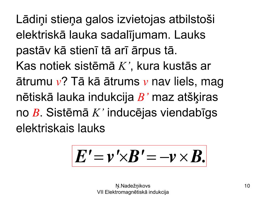 bas ātrumu –v’, dabūjam elektriskā lau ka intensitātes izteiksmi sistēmā K’: E’= - v’B. Šī izteiksme ir spēkā jebkurā inerciālā atskaites sistēmā K, kurā magnētiskā lauka avoti kustas ar ātrumu v, t.i. E = - vB. Ņ.Nadežņikovs VII Elektromagnētiskā indukcija
