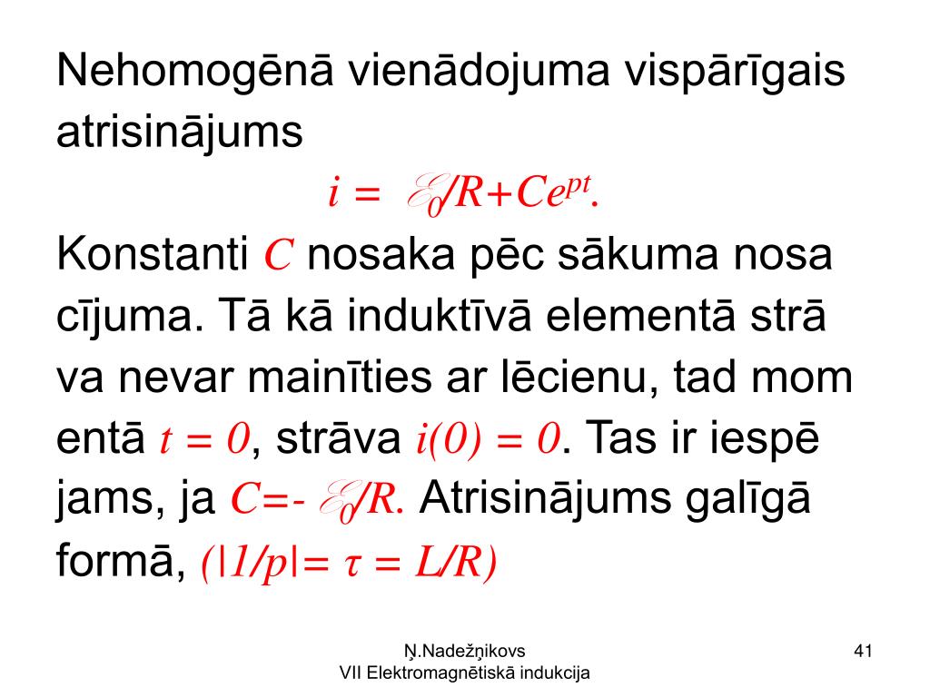 Nehomogēnā vienādojuma vispārīgais atrisinājums i = E0/R+Cept. Konstanti C nosaka pēc sākuma nosa cījuma. Tā kā induktīvā elementā strā va nevar mainīties ar lēcienu, tad mom entā t = 0, strāva i(0) = 0. Tas ir iespē jams, ja C=-E0/R. Atrisinājums galīgā formā, (|1/p|= τ = L/R) Ņ.Nadežņikovs VII Elektromagnētiskā indukcija