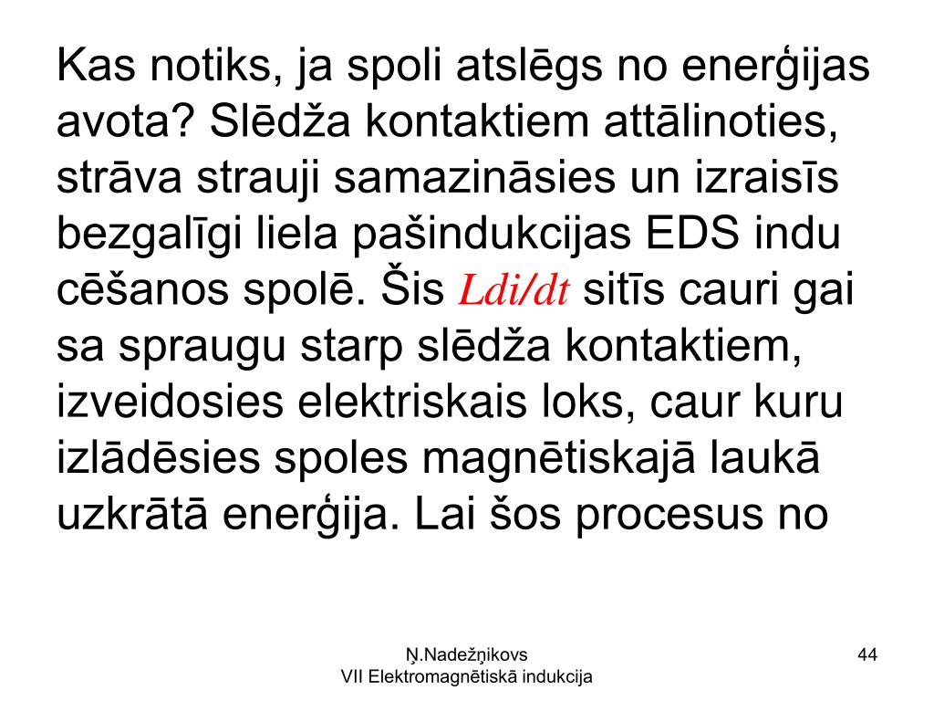 Kas notiks, ja spoli atslēgs no enerģijas avota? Slēdža kontaktiem attālinoties, strāva strauji samazināsies un izraisīs bezgalīgi liela pašindukcijas EDS indu cēšanos spolē. Šis Ldi/dt sitīs cauri gai sa spraugu starp slēdža kontaktiem, izveidosies elektriskais loks, caur kuru izlādēsies spoles magnētiskajā laukā uzkrātā enerģija. Lai šos procesus no Ņ.Nadežņikovs VII Elektromagnētiskā indukcija