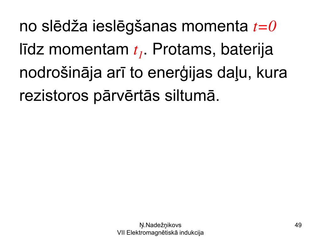 no slēdža ieslēgšanas momenta t=0 līdz momentam t1. Protams, baterija nodrošināja arī to enerģijas daļu, kura rezistoros pārvērtās siltumā. Ņ.Nadežņikovs VII Elektromagnētiskā indukcija