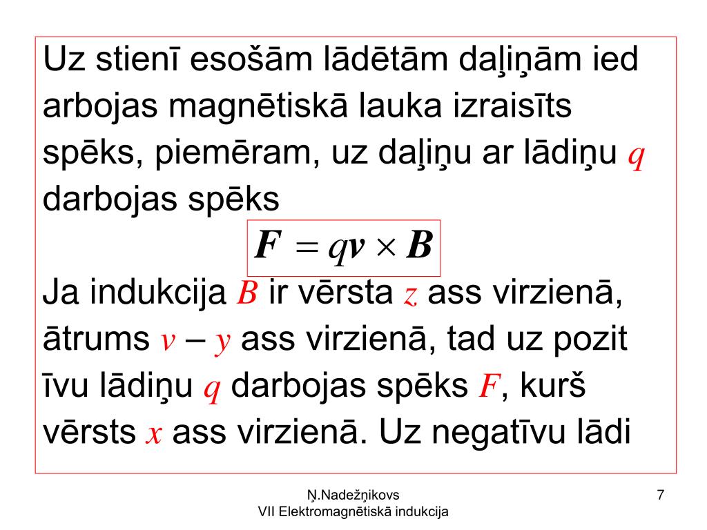7.3. Elektromagnētiskā indukcija no elektronu teorijas viedokļa Ja laboratorijas atskaites sistēmā K ma gnētiskajā laukā ar indukciju B kustas lādiņš q ar ātrumu v, tad novērotājs ša jā atskaites sistēmā konstatē, ka uz lā diņu darbojas magnētiskais Lorenca spēks F = qvB. Lādiņa atskaites sistēmā K’, kas attiecī Ņ.Nadežņikovs VII Elektromagnētiskā indukcija