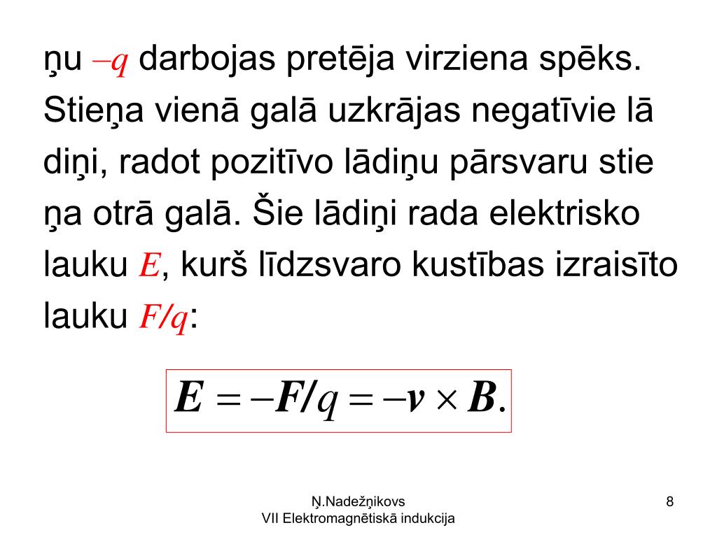 ņu –q darbojas pretēja virziena spēks. Stieņa vienā galā uzkrājas negatīvie lā diņi, radot pozitīvo lādiņu pārsvaru stie ņa otrā galā. Šie lādiņi rada elektrisko lauku E, kurš līdzsvaro kustības izraisīto lauku F/q: Ņ.Nadežņikovs VII Elektromagnētiskā indukcija