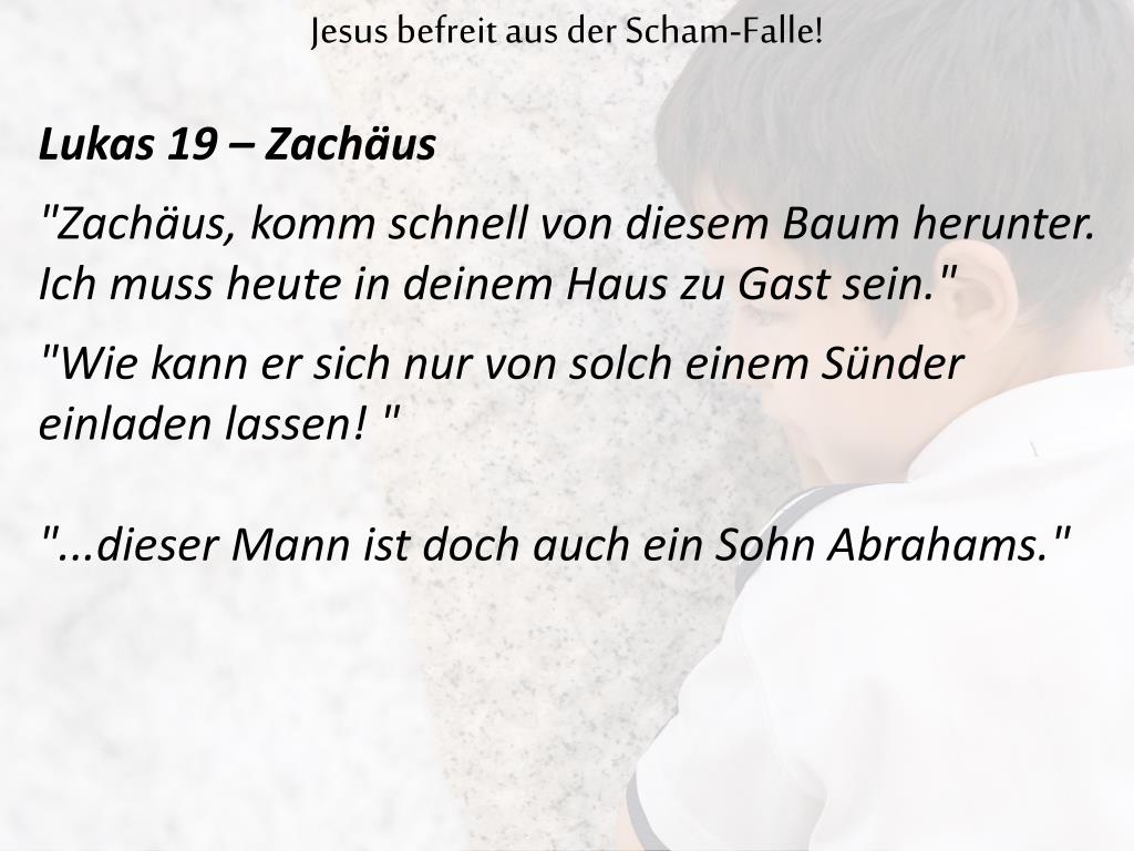 Jesus befreit aus der Scham-Falle! Lukas 19 – Zachäus "Zachäus, komm schnell von diesem Baum herunter. Ich muss heute in deinem Haus zu Gast sein." "Wie kann er sich nur von solch einem Sünder einladen lassen! " "...dieser Mann ist doch auch ein Sohn Abrahams."