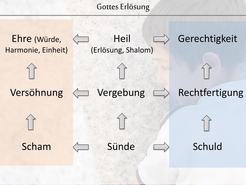 Gottes Erlösung Ehre (Würde, Harmonie, Einheit) Gerechtigkeit Versöhnung Rechtfertigung Scham Sünde Schuld