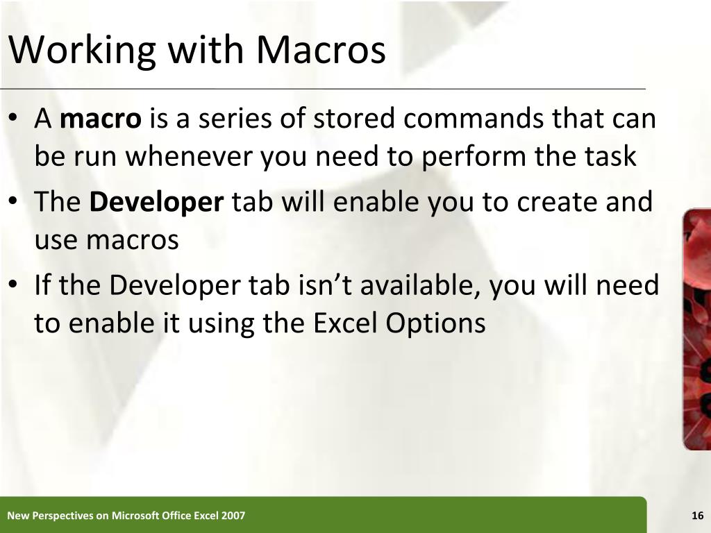 Working with Macros • A macro is a series of stored commands that can be run whenever you need to perform the task • The Developer tab will enable you to create and use macros • If the Developer tab isn’t available, you will need to enable it using the Excel Options New Perspectives on Microsoft Office Excel 2007