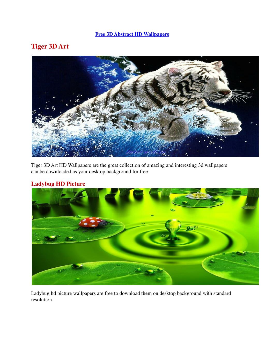 Free3DAbstractHDWallpapers Tiger3DArt Tiger3DArtHDWallpapersarethegreatcollectionofamazingandinteresting3dwallpapers canbedownloadedasyourdesktopbackgroundforfree. LadybugHDPicture Ladybughdpicturewallpapersarefreetodownloadthemondesktopbackgroundwithstandard resolution.
