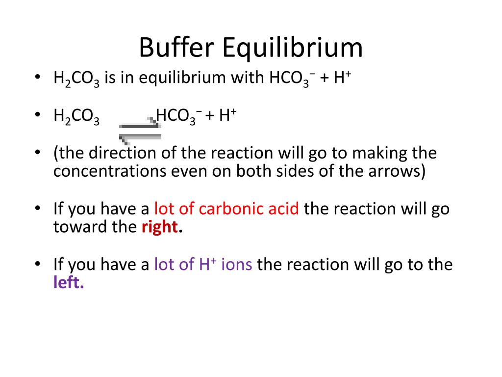 Buffer Equilibrium • H2CO3is in equilibrium with HCO3− + H+ • H2CO3 HCO3− + H+ • (the direction of the reaction will go to making the concentrations even on both sides of the arrows) • If you have a lot of carbonic acid the reaction will go toward the right. • If you have a lot of H+ ions the reaction will go to the left.