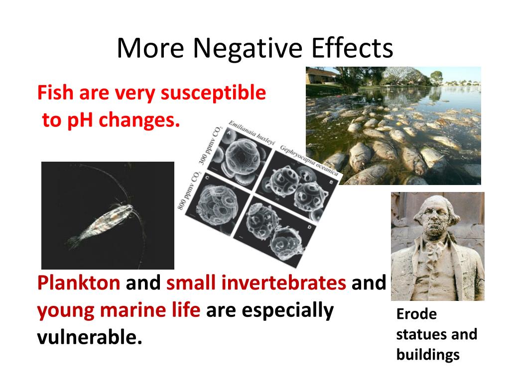 More Negative Effects Fish are very susceptible to pH changes. Plankton and small invertebrates and young marine life are especially vulnerable. Erode statues and buildings
