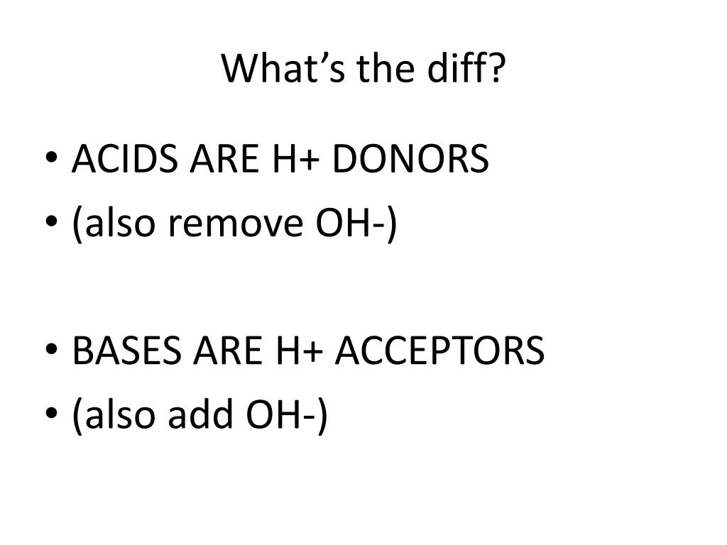What’s the diff? • ACIDS ARE H+ DONORS • (also remove OH-) • BASES ARE H+ ACCEPTORS • (also add OH-)