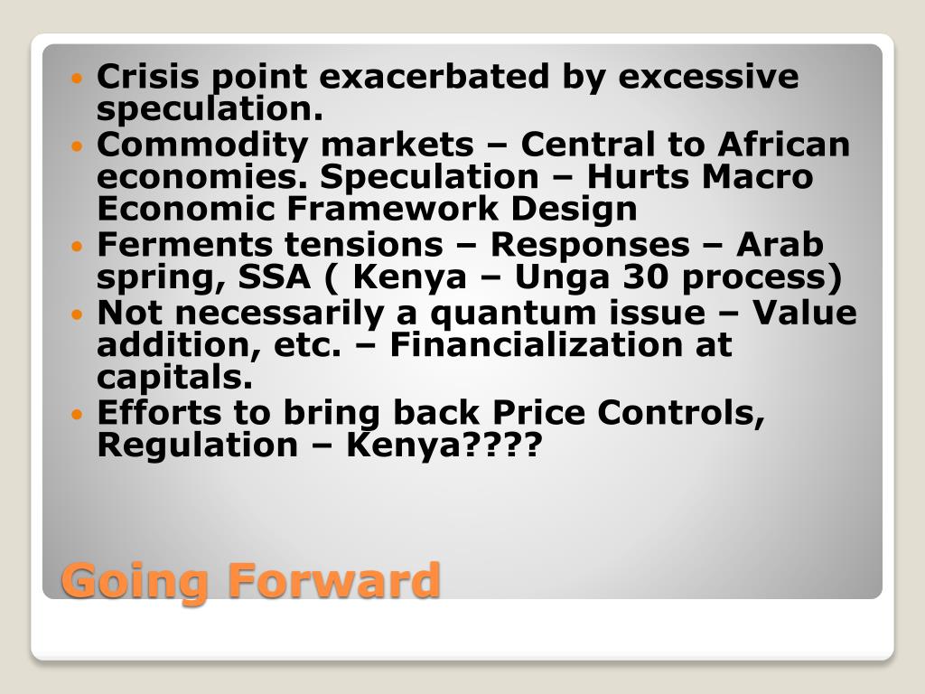 Crisis point exacerbated by excessive speculation. • Commodity markets – Central to African economies. Speculation – Hurts Macro Economic Framework Design • Ferments tensions – Responses – Arab spring, SSA ( Kenya – Unga 30 process) • Not necessarily a quantum issue – Value addition, etc. – Financialization at capitals. • Efforts to bring back Price Controls, Regulation – Kenya???? Going Forward