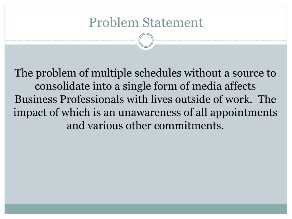 Problem Statement The problem of multiple schedules without a source to consolidate into a single form of media affects Business Professionals with lives outside of work. The impact of which is an unawareness of all appointments and various other commitments.