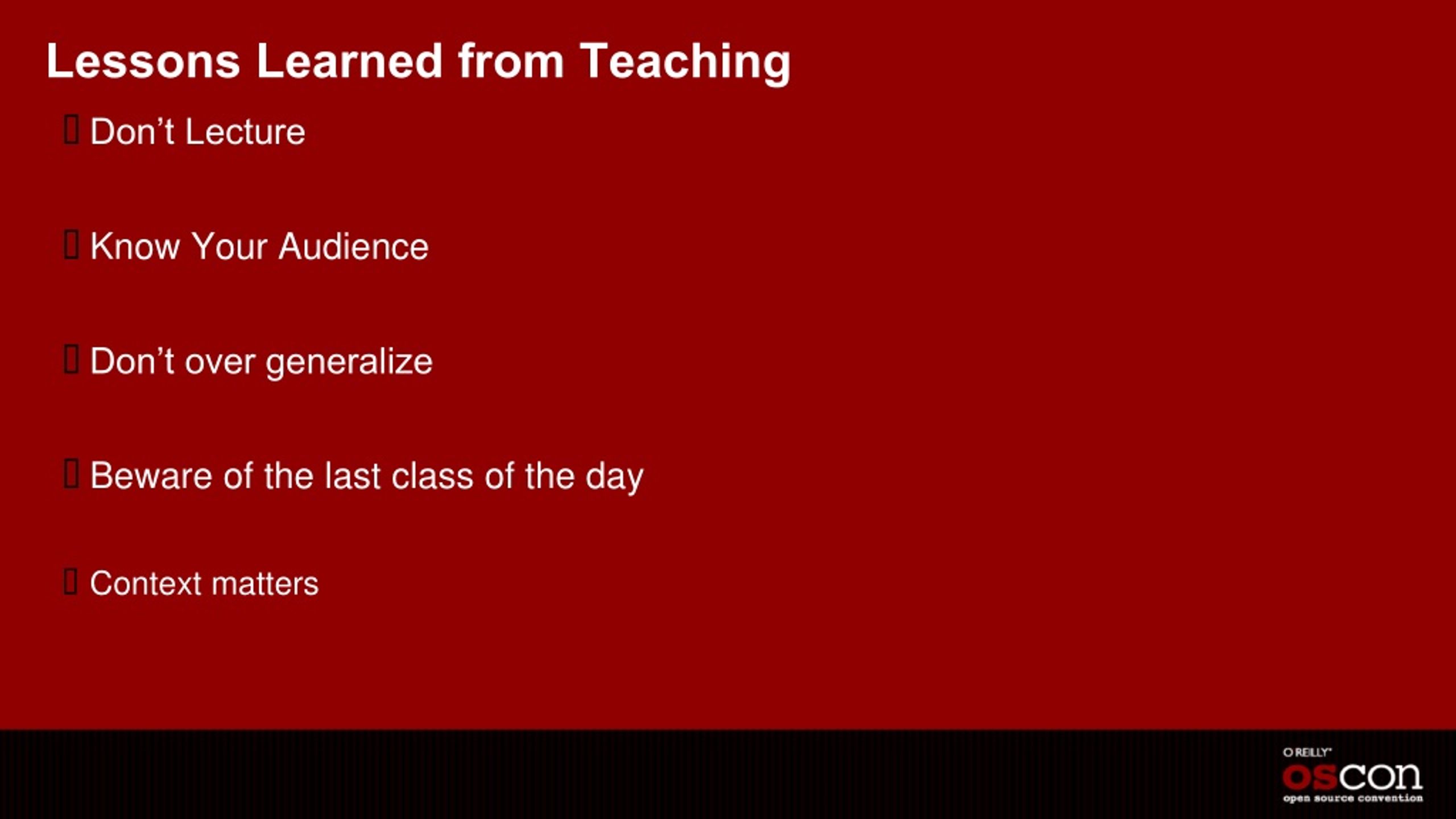 Lessons Learned from Teaching • Don’t Lecture • Know Your Audience • Don’t over generalize • Beware of the last class of the day • Context matters