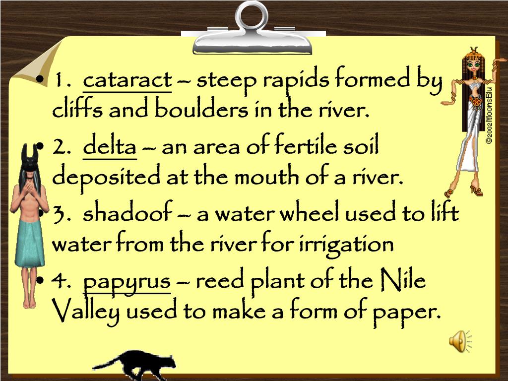 1. cataract – steep rapids formed by cliffs and boulders in the river. • 2. delta – an area of fertile soil deposited at the mouth of a river. • 3. shadoof – a water wheel used to lift water from the river for irrigation • 4. papyrus – reed plant of the Nile Valley used to make a form of paper.