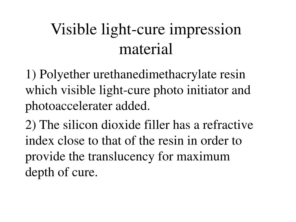 Visible light-cure impression material 1) Polyether urethanedimethacrylate resin which visible light-cure photo initiator and photoaccelerater added. 2) The silicon dioxide filler has a refractive index close to that of the resin in order to provide the translucency for maximum depth of cure.