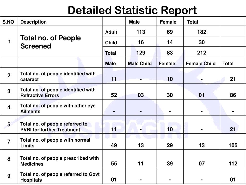 Dr.Ranganath : OphthalmologistCol. Ramana Rao : Manager - ProjectsN.Karunakar : Camp CoordinatorYadagiri : Camp CoordinatorY.Nagaraju : OptometristShiva Prasad : Field OrganizerNagaraju : Field Organizer PVRI TEAM Members