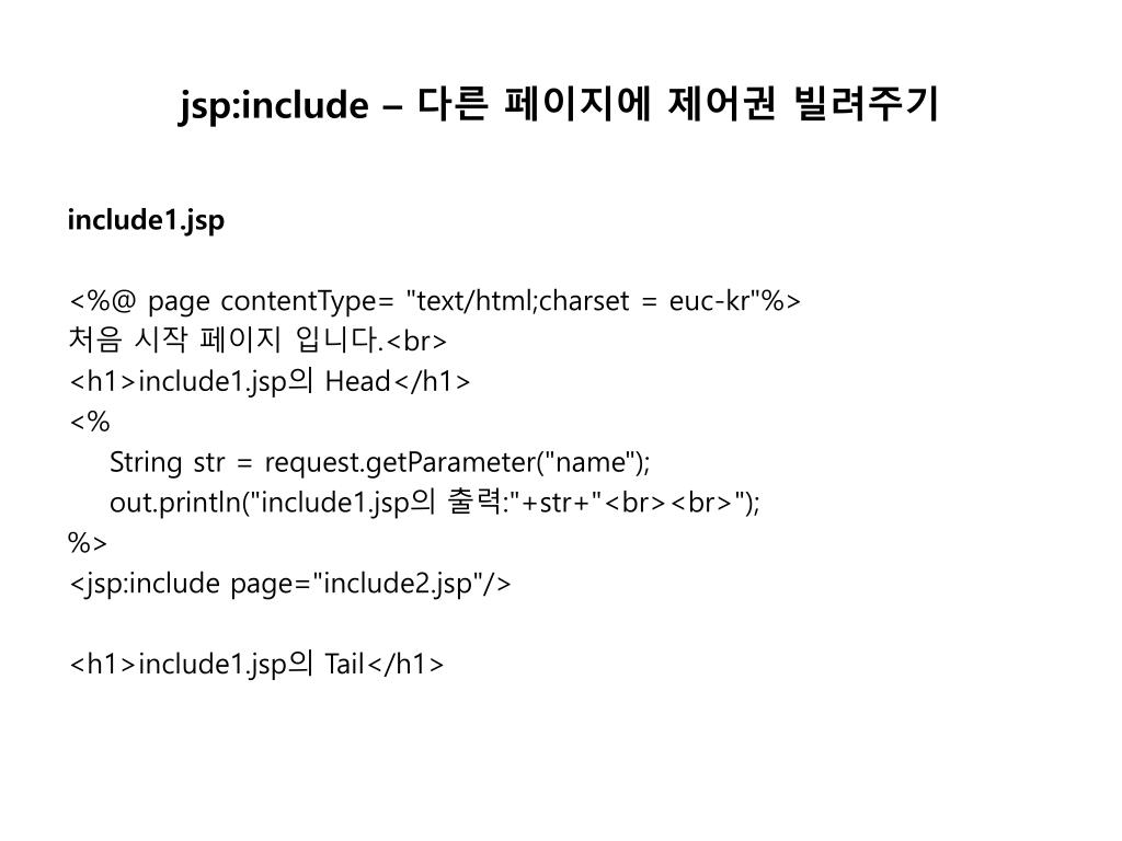jsp:include – 다른 페이지에 제어권 빌려주기 include1.jsp <%@ page contentType= "text/html;charset = euc-kr"%> 처음 시작 페이지 입니다.<br> <h1>include1.jsp의 Head</h1> <% String str = request.getParameter("name"); out.println("include1.jsp의 출력:"+str+"<br><br>"); %> <jsp:include page="include2.jsp"/> <h1>include1.jsp의 Tail</h1>