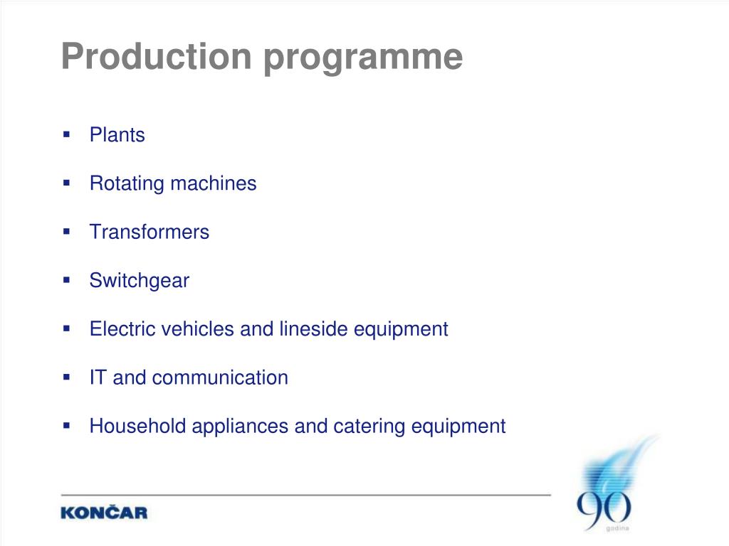 Production programme • Plants • Rotating machines • Transformers • Switchgear • Electric vehicles and lineside equipment • IT and communication • Household appliancesandcateringequipment
