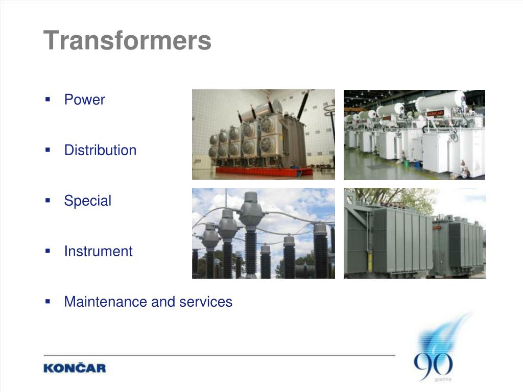KONČAR - Electrical Industry, Inc. ENERGY AND TRANSPORT INDUSTRY AND TRADE DEVELOPMENT AND SERVICES COMPANIES ABROAD POWER PLANT AND EL. TRACTION ENGINEERING HOUSEHOLD APPLIANCES INSTITUTE FOR ELECTRICAL ENGINEERING SWITZERLAND INFRASTRUCTURE AND SERVICES CATERING EQUIPMENT GENERATORS AND MOTORS HIGH VOLTAGE SWITCHGEAR TOOLS REPRESENTATIVE OFFICES SMALL ELECTRICAL MACHINES MEDIUM VOLTAGE APPARATUS RUSSIAN FEDERATION LOW VOLTAGE SWITCHGEAR AND CIRCUIT BREAKERS SWITCHGEAR BOSNIA AND HERZEGOVINA DISTRIBUTION AND SPECIAL TRANSFORMERS SERBIA AFFILIATED COMPANY INSTRUMENT TRANSFORMERS ELECTRONICS AND INFORMATICS POWER TRANSFORMERS METAL STRUCTURES ELECTRIC VEHICLES ENG. FOR PLANT INSTALLATION & COMMISSIONIG RENEWABLE SOURCES