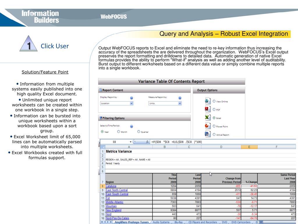 1 Query and Analysis – Robust Excel Integration Click User Output WebFOCUS reports to Excel and eliminate the need to re-key information thus increasing the accuracy of the spreadsheets the are delivered throughout the organization. WebFOCUS’s Excel output preserves the report formatting and drilldowns to detailed data. Automatic generation of native Excel formulas provides the ability to perform "What-if” analysis as well as adding another level of auditability. Burst output to different worksheets based on a different data value or simply combine multiple reports into a single workbook. • Solution/Feature Point • Information from multiple systems easily published into one high quality Excel document. • Unlimited unique report worksheets can be created within one workbook in a single step. • Information can be bursted into unique worksheets within a workbook based upon a sort group. • Excel Worksheet limit of 65,000 lines can be automatically parsed into multiple worksheets. • Excel Workbooks created with full formulas support. ** Information Builders Confidential **